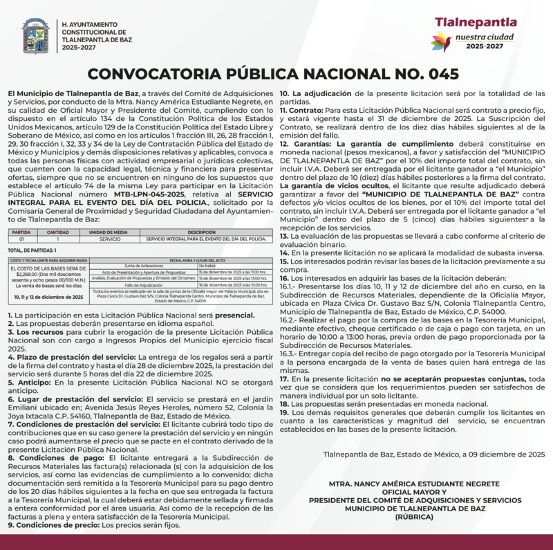 El Ayuntamiento de Tlalnepantla presenta Convocatoria Pública Nacional No. 045