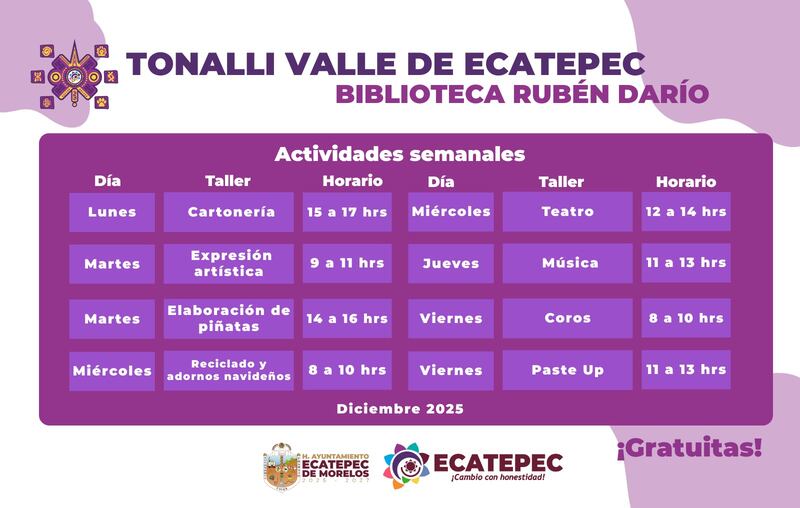 Con el objetivo de fortalecer el acceso a la cultura, el arte y la recreación comunitaria, el espacio Tonalli Valle de Ecatepec, a través de la Biblioteca Rubén Darío, presentó su programa de actividades semanales gratuitas dirigidas a personas de todas las edades, correspondientes al mes de diciembre de 2025.