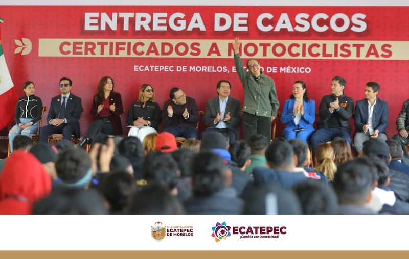 Autoridades municipales, estatales y federales participaron en la entrega de cascos certificados en el Deportivo Ejidal Emiliano Zapata, como parte de una estrategia para fortalecer la seguridad vial y proteger la vida de las y los motociclistas en el municipio de Ecatepec.