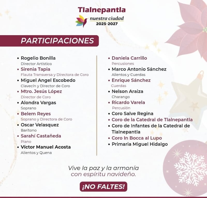 El evento, impulsado por el Gobierno de Tlalnepantla, forma parte de las actividades culturales que buscan fortalecer el tejido social y promover espacios de convivencia familiar durante la temporada navideña. A través de la música coral e instrumental, se invita a las y los asistentes a reflexionar sobre valores como la solidaridad, la armonía y el encuentro comunitario.