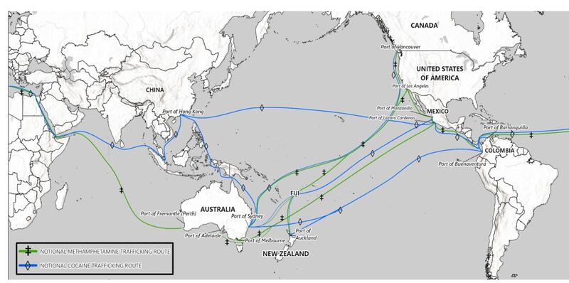 Según la DEA, las autoridades locales señalan que los envíos de metanfetaminas provenientes de México, ocultos mediante métodos de contrabando cada vez más sofisticados, continúan llegando a Oceanía principalmente por cargamentos aéreos y marítimos. Muchos de estos traslados son transbordados y reexportados desde América del Norte y Asia antes de arribar a su destino final.