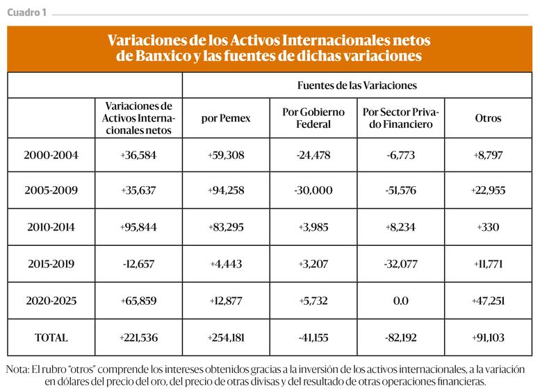 Cinco años después de la crisis de 1995, el saldo de dichas reservas ascendía apenas a 2,184 millones de dólares. Para agosto de 2025, sin embargo, el Banco de México registraba un nivel de 249 mil millones de dólares. Este incremento se explica por los 254 mil millones de dólares que Pemex transfirió al banco central durante el periodo, así como por las compras realizadas por Banxico a los bancos tras la crisis financiera internacional (véase cuadro 1).