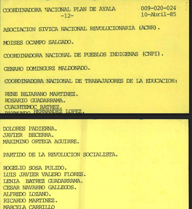 En el caso de Lenia, el expediente que se le abrió, fue por ser militante del Partido de la Revolución Socialista, en el cual también participaron personas como Rogelio Sosa Pulido y César Navarro Gallegos, mientras que su mamá, Rosario Guadarrama, fue investigada por formar parte de la Confederación Nacional de Trabajadores de la Educación (CNTE), junto a Cuauhtémoc Batres y René Bejarano, también conocido como “El señor de las ligas”.