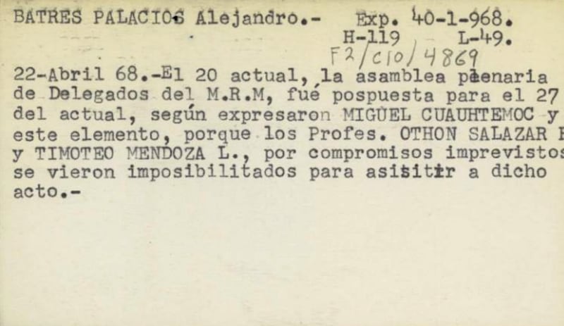 Ese mismo año, también el hermano de Cuauhtémoc, Alejandro Batres Palacios, fue investigado por el Estado por su cercanía con los profesores y guerrilleros Othón Salazar y Timoteo Mendoza, dentro del Movimiento Revolucionario del Magisterio.