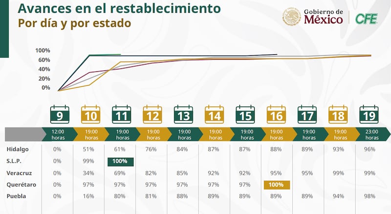 El servicio se ha restablecido en su totalidad en los estados de San Luis Potosí y Querétaro, mientas que en Veracruz, aunque se había logrado también un 100%, las lluvias causaron estragos en 800 metros de red de media tensión que afectaron a 4,533 familias, de los que ya se restableció el servicio en 3,865 hogares.