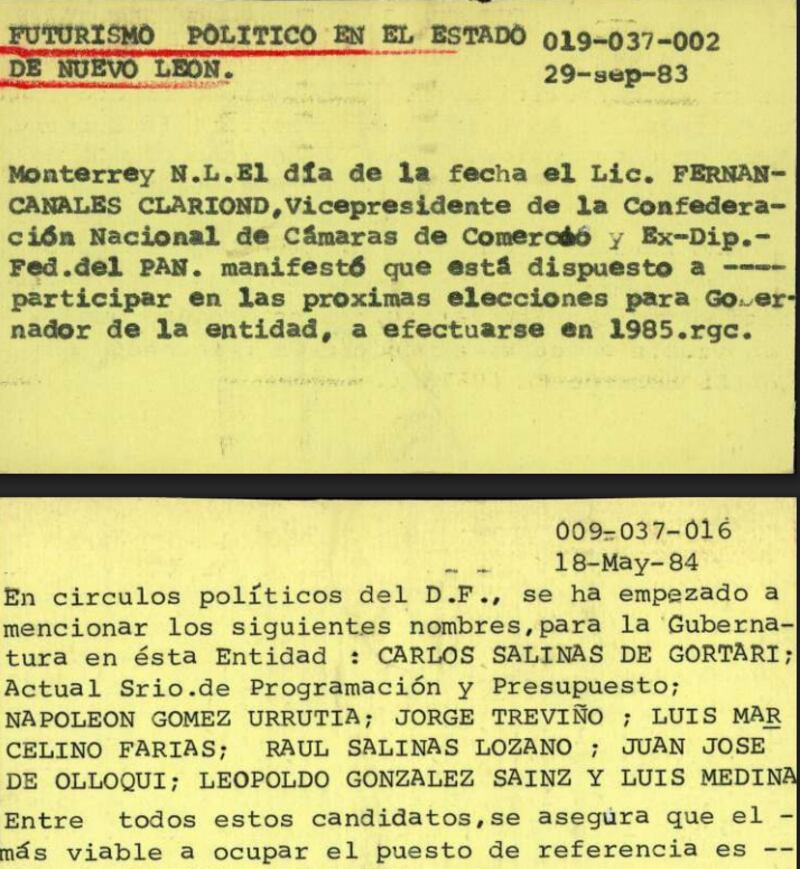 De acuerdo al expediente 019-037-002 de dicha agencia de inteligencia, en los círculos políticos del extinto Distrito Federal se preveía que Salinas de Gortari, en ese entonces secretario de Programación y Presupuesto del sexenio de Miguel de la Madrid, fuera el abanderado del partido tricolor a la gubernatura de Nuevo León.