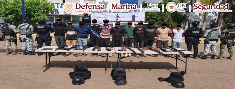 De manera simultánea, en el municipio de Navolato, los efectivos detuvieron a 11 personas a bordo de dos vehículos, uno de ellos con blindaje artesanal, les aseguraron dos ametralladoras, siete armas largas, tres armas cortas, 21 cargadores, 868 cartuchos y equipo táctico.