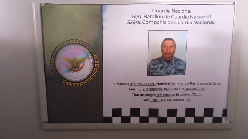 En la primera se lee: “Guardia Nacional. 51/o. Batallón de Guardia Nacional. 329/a. Compañía de Guardia Nacional”. Al centro de la foto de plano busto (tamaño para centrarse en la persona) , un hombre de tez morena, bigote, con barba en ciernes. Playera negra debajo del uniforme. Y en el lado derecho de la solapa, su placa. Dice “Pérez... PE...MEX”, casi imperceptiblemente. Otros datos sobresalen. “Empleo: Sgto. 2/o. de G.N. Nombre: Yair Manuel Ramírez de la Cruz. Matrícula: D-3392726. Fecha de alta: 01/jun/2013.