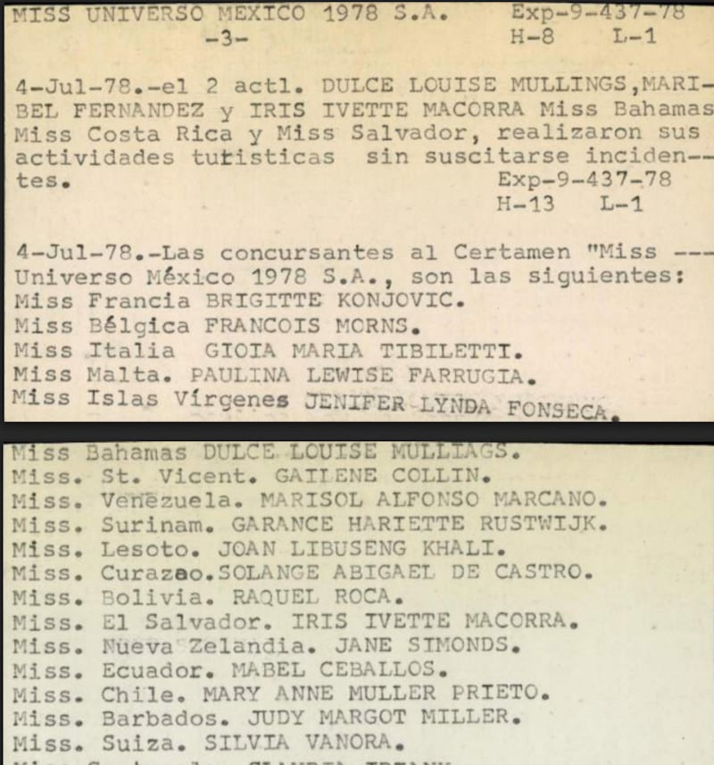 A partir de julio de 1978, mientras Acapulco se alistaba para recibir a las concursantes, la DFS armó expedientes de todas las personas relacionadas a Miss Universo, lo que incluía a funcionarios federales, burócratas del sector turismo, directivos del certamen, así como a Ernesto Soto Gabucio, presidente del comité de organización en México.