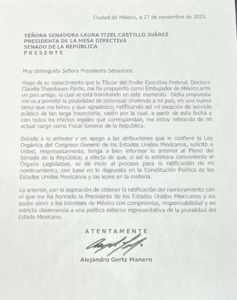 Su salida, que ocurre antes de que concluyera su periodo en 2028, llegó acompañada de una misiva dirigida al Senado en la que confirma que la presidenta Claudia Sheinbaum lo propuso para ocupar una embajada.