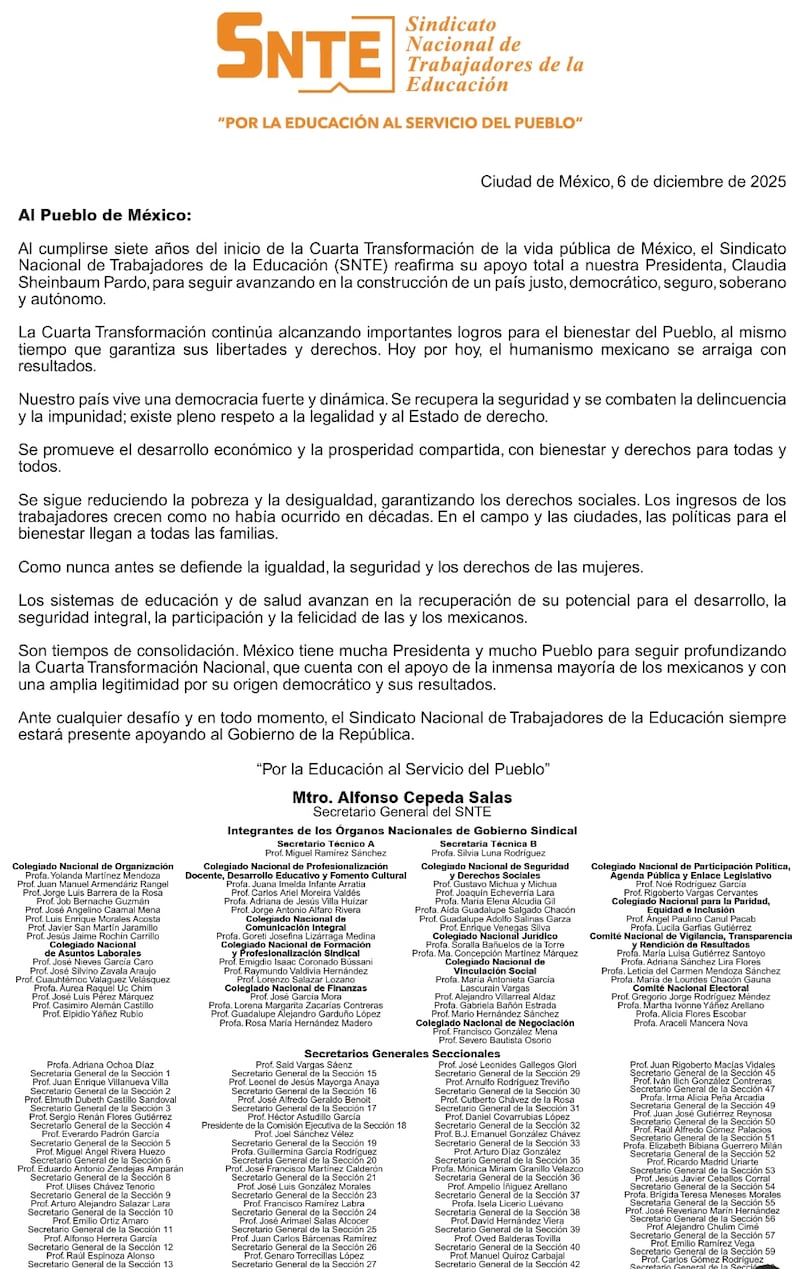 A través de una manifestación pública firmada por firmada por los integrantes de los Órganos Nacionales de Gobierno Sindical y las secretarias generales seccionales del organismo, dijo que hoy por hoy el humanismo mexicano se arraiga con resultados.