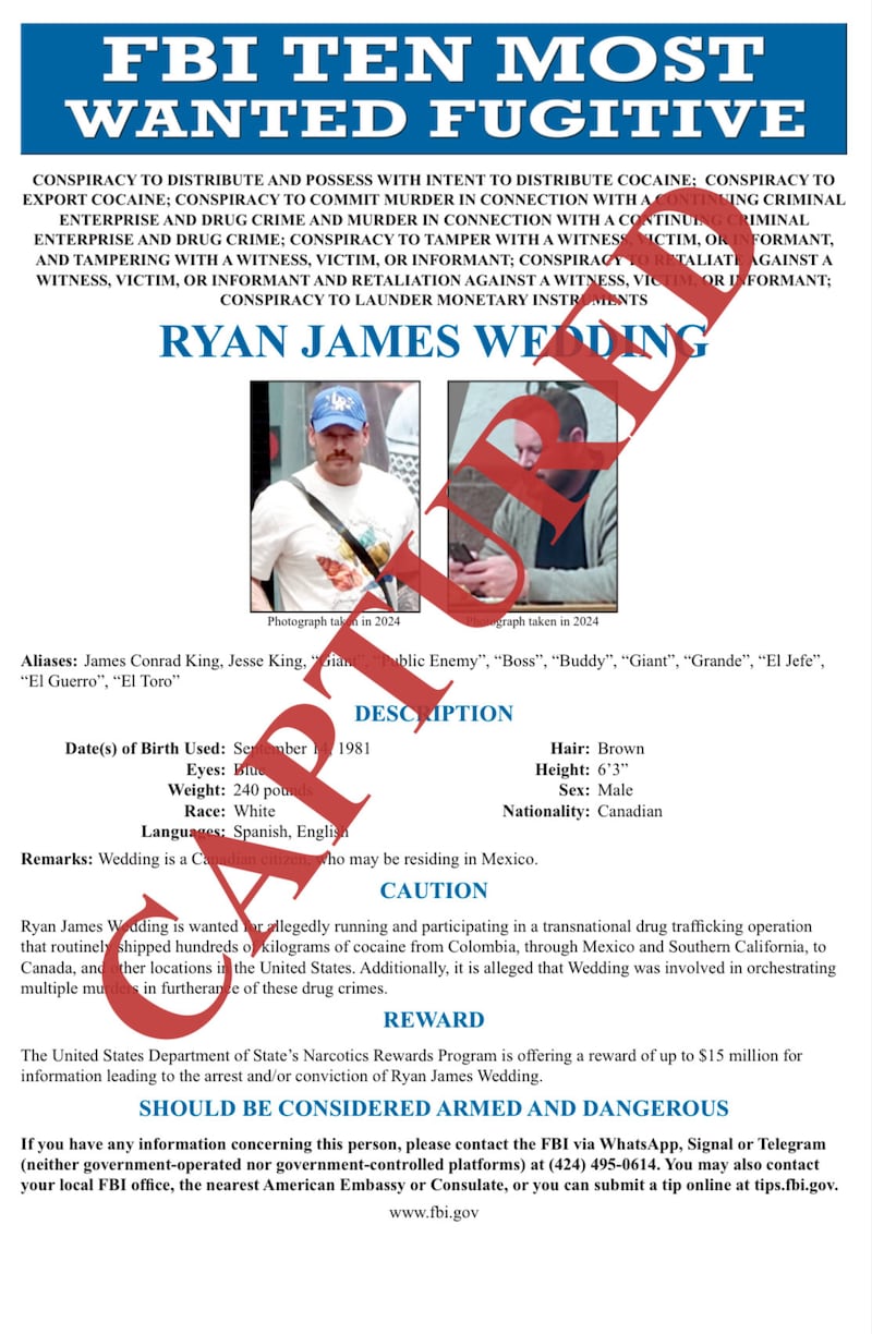 Agregó que Wedding ha estado escondido en México durante más de una década y ha sido buscado por cargos de tráfico de cocaína y asesinato desde 2024.