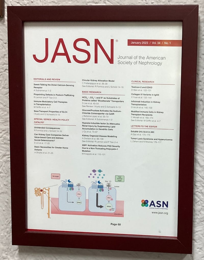 Que un artículo original en el que eres el autor responsable sea resaltado en la portada de una revista de alto nivel es algo que cuando ocurre, te llena de mucha satisfacción. He sido profesor visitante en varias universidades en Estados Unidos y, cuando te entrevistas con investigadores del grupo al que visitas, puedes ver que algunos de ellos tienen en su oficina un cuadro con una portada de una revista, que con frecuencia contiene imágenes histológicas. No tienes que preguntar. Sabes que esa portada en el cuadro es porque fue un artículo original de la persona con quien estás platicando y escogieron una imagen para la portada. Recuerdo la primera vez que una fotografía de un artículo de mi mentor Steve Hebert fue elegida para la portada de una revista. Lo puso en un cuadro en su oficina. En enero de 2023, el Journal of the American Society of Nephrology utilizó la figura final de un artículo nuestro para la portada. Por supuesto, el cuadro está en mi oficina.