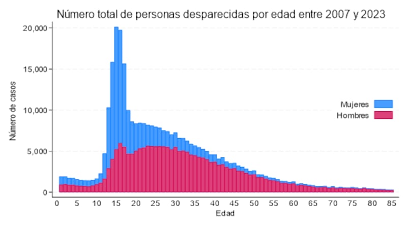 Los datos son contundentes. Antes de los 11 años, aproximadamente la mitad de las personas desaparecidas son mujeres. Entre los 12 y los 18 años, esta proporción no desciende del 50 por ciento y alcanza un pico del 75 por ciento entre los 14 y 15 años: tres de cada cuatro personas desaparecidas en ese rango de edad son mujeres. A partir de los 19 años, la proporción femenina cae de forma sostenida hasta representar alrededor del 20 por ciento en edades adultas.