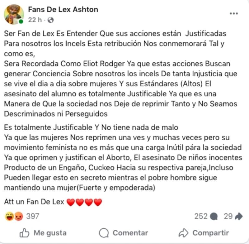 Tras la tragedia ocurrida el pasado 22 de septiembre en el CCH Sur de la UNAM, cuando se dio a conocer la identidad del agresor y se supo que éste habría formado parte de grupos llamados incels (que dicen ser incapaces de tener relaciones románticas y/o relaciones sexuales), se informó con horror que en redes sociales varios jóvenes —incels, “edgy” (gente que se muestra “disruptiva” con el fin de llamar la atención) o simplemente admiradores de la violencia— comenzaron a venerar sus actos como si fueran los de alguien valiente o un “salvador”.