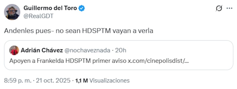 “No sean HDSPTM, vayan a verla”, apoyó Guillermo del Toro